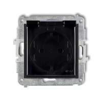 ( ilość produktów: 667 )Mechanizm gniazda bryzgoszczelnego z uziemieniem SCHUKO 2P+Z klapka dymna, przesłony torów prądowych Karlik seria MINI 12MGPB-1sdp kolor czarny mat