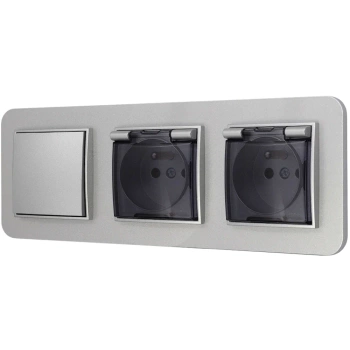 Włącznik podwójny i dwa gniazda hermetyczne z ramką zaokrągloną seria MINI kolor srebrny